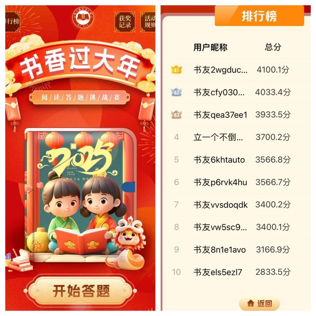 活动期间,许多参与者纷纷表达了对“书香过大年”活动的喜爱与支持,字里行间流露出浓浓的书香情谊和年味记忆。未来,湖南省将继续依托数字农家书屋平台,不断创新服务方式,丰富服务内容,积极开展更多农民群众喜闻乐见的阅读活动,让书香飘满三湘大地,为乡村振兴凝聚强大精神力量。活动最终排行: